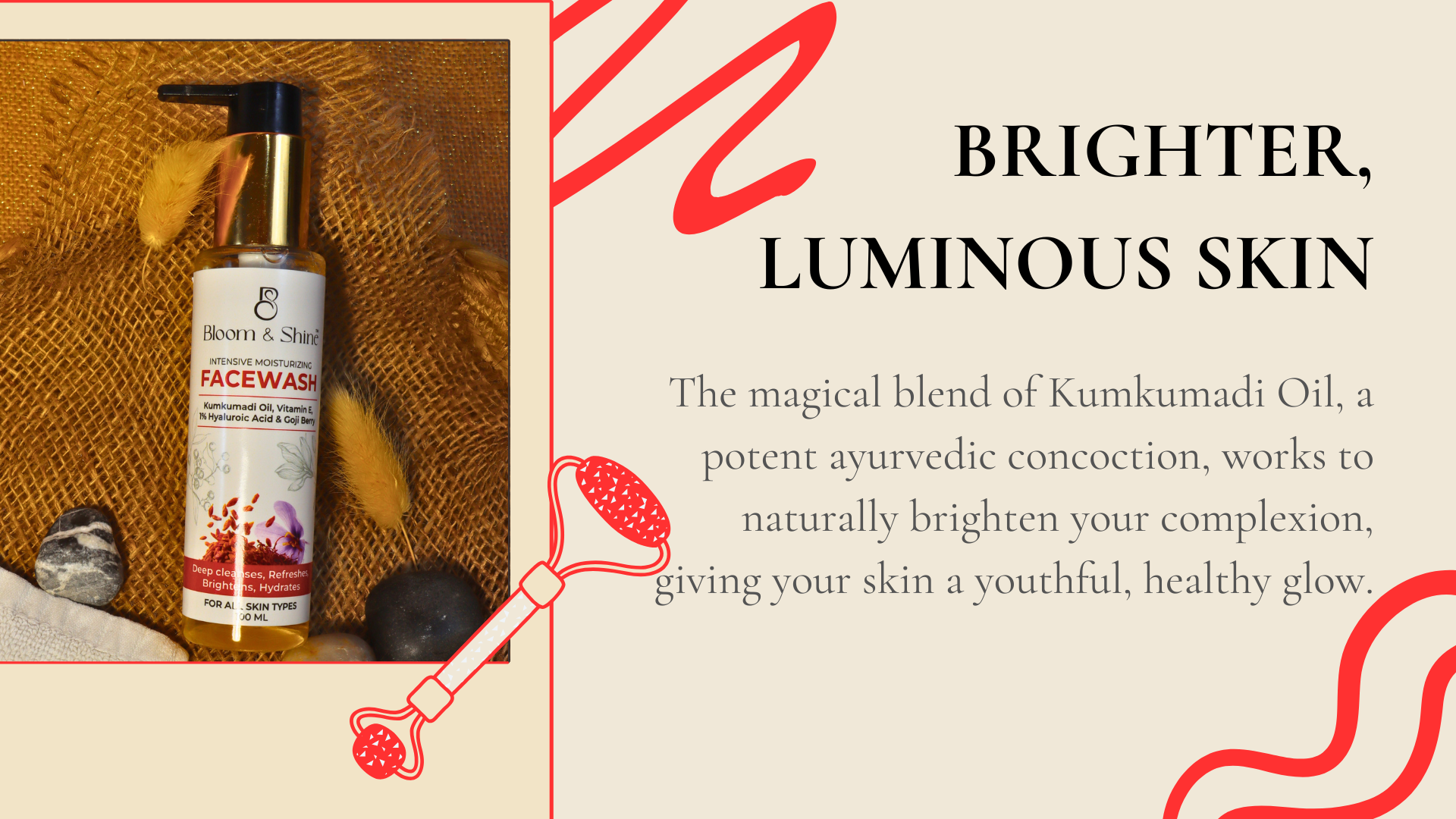 It combines Ayurvedic Kumkumadi Oil and Vitamin E, offering gentle cleansing, hydration, and antioxidant protection, while brightening your skin and improving tone without stripping natural moisture.