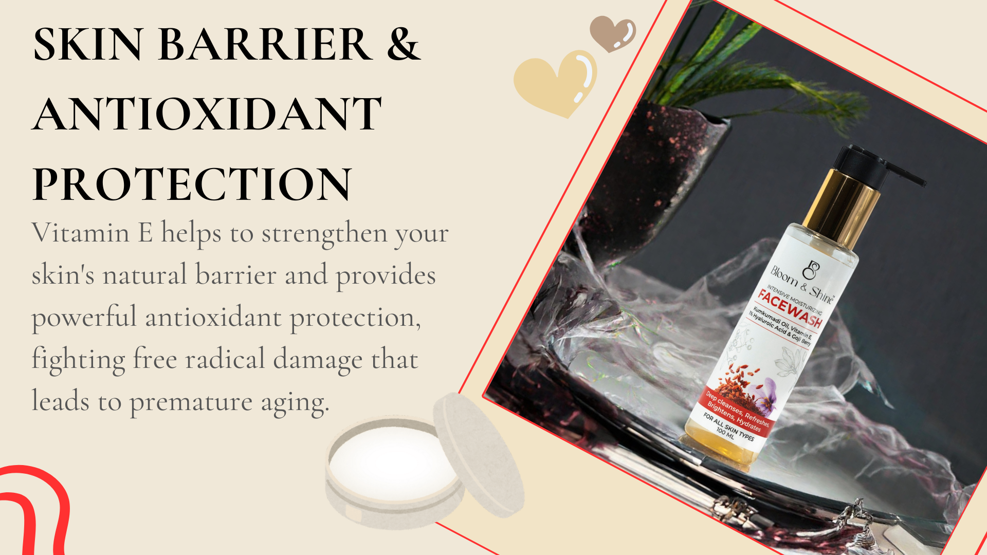 • Vitamin E: A potent antioxidant that helps strengthen the skin barrier, protects against environmental damage, and promotes overall skin health.
